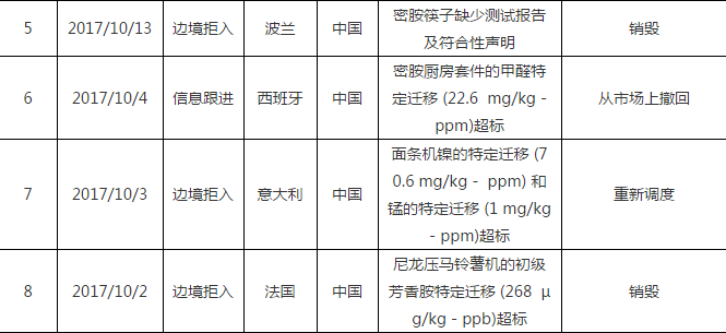 2017年10月歐盟食品及飼料快速預(yù)警系統(tǒng)(RASFF)共對華通報(bào)食品接觸材料類產(chǎn)品抽檢不合格案例8起。通報(bào)國成員包括意大利、芬蘭、德國、波蘭、西班牙、法國、斯洛伐克。其中,餐廚具仍然為主要被通報(bào)的產(chǎn)品類型。本月被通報(bào)的原因主要是甲醛、初級芳香胺、鎳、錳、鉛特定遷移超標(biāo)。CTI建議相關(guān)生產(chǎn)企業(yè)引起重視,詳情請見下表。